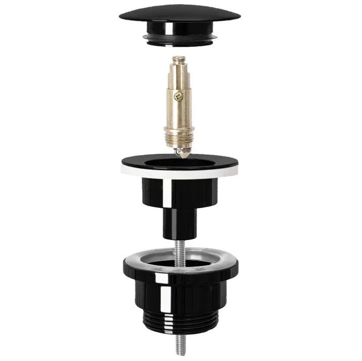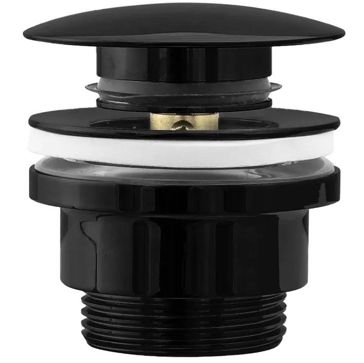 Чорний глянцевий донний клапан з функцією клік-клак, універсальний, підходить для умивальників як з переливним отвором, так і без нього. Завдяки спеціальному етапу виробництва пробка захищена від корозії, потьмарення та знебарвлення.