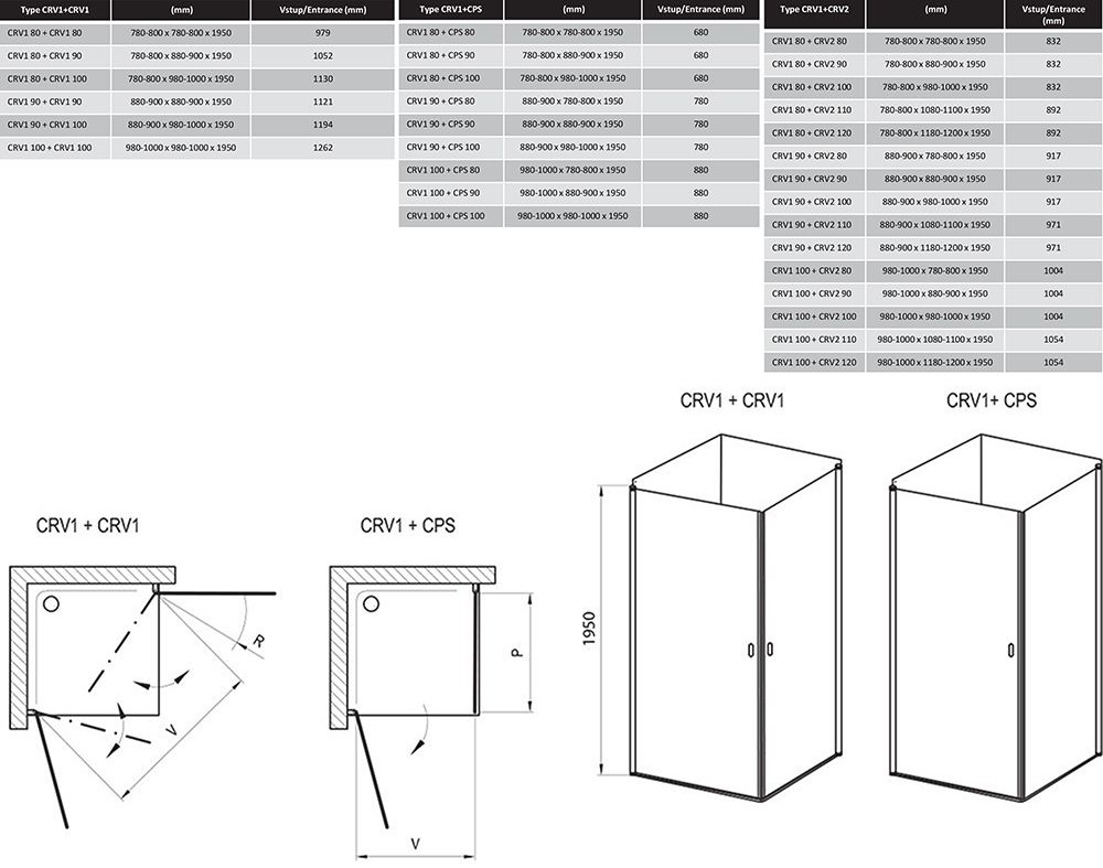 Один виріб CRV1 утворює половину прямокутної душової кабіни. Для створення прямокутної душової кабіни необхідно замовити 2 шт. CRV1.