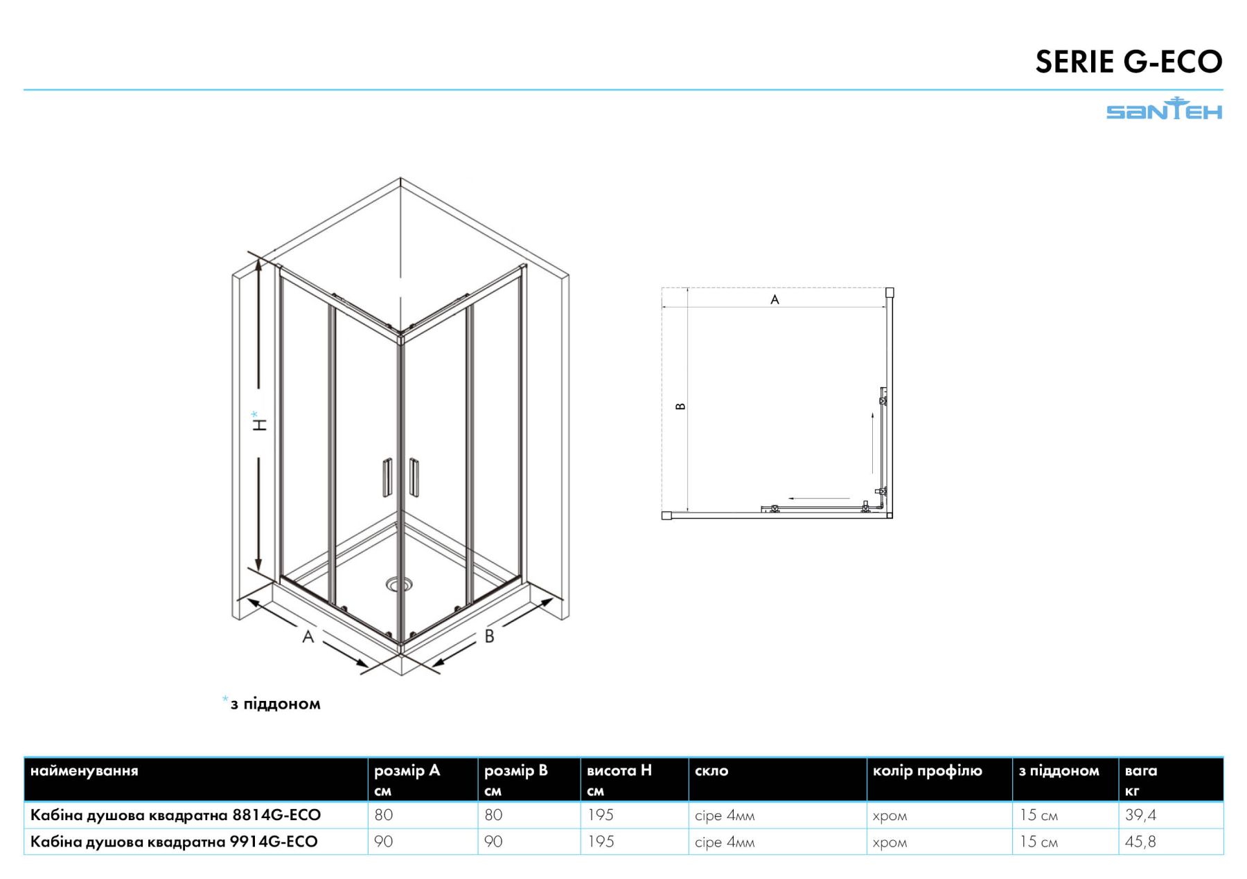 Душова кабіна SANTEH 90x90 9914G-ECO з піддоном 15см | NAVARA24759