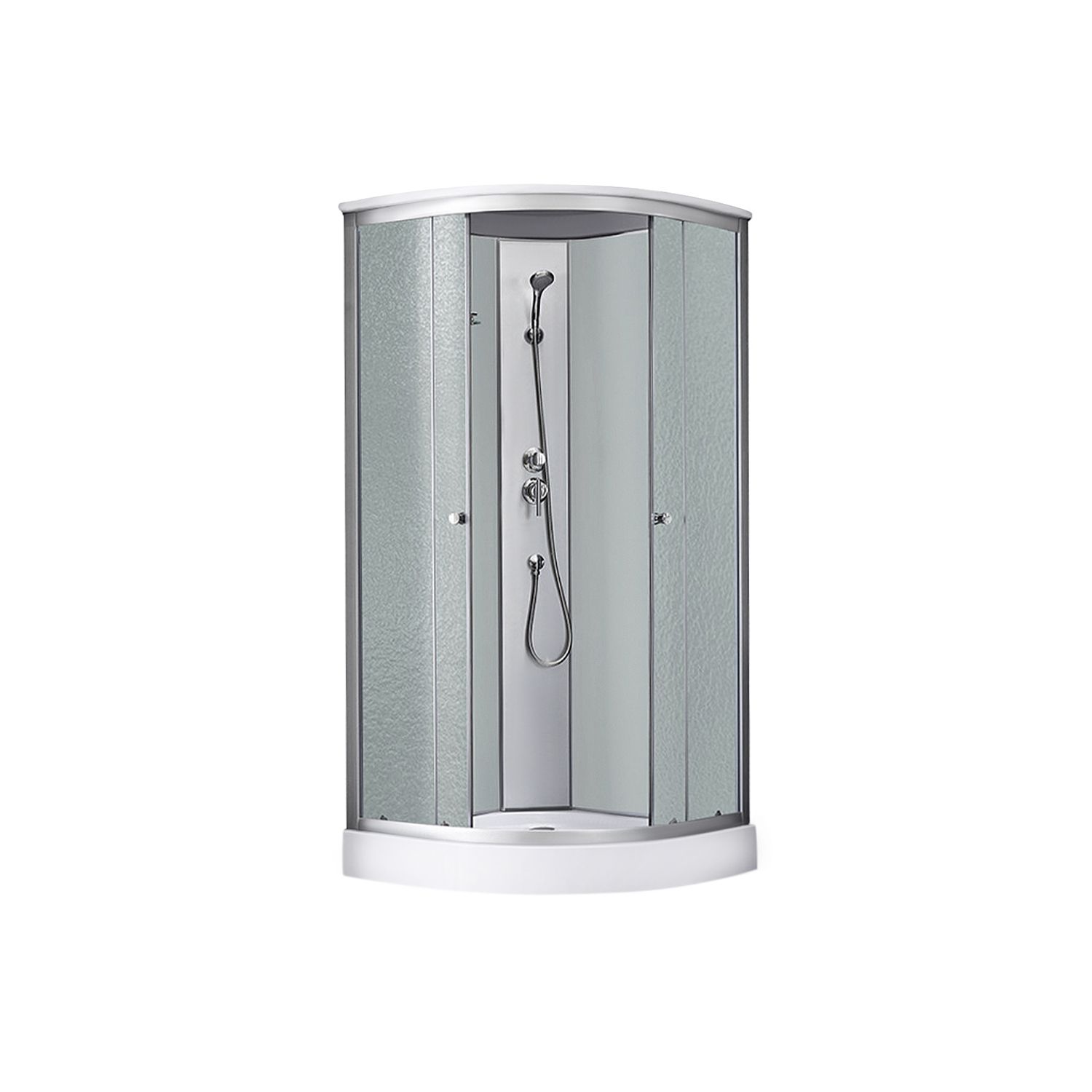 Душовий бокс Kroner KRP Enzo - WD.C.F.F. 90x90 см - це стильне і функціональне рішення для вашої ванної кімнати. Душевой бокс має компактні розміри 90x90 см і форму чверті круга. Ця форма ідеально підходить для ванних кімнат з обмеженим простором. Піддон низький і має висоту всього 145 мм. Виготовлений з високоякісного акрилу, він є міцним і довговічним. Глибина піддону становить 40 мм, забезпечуючи зручність під час прийому душу. Конструкція дверей - розсувна, а матеріал полотна дверей - скло з рифленою текстурою. Це не тільки надає виробу елегантний вигляд, але і забезпечує вашу конфіденційність під час душу. До комплекту душового боксу входить велика кількість необхідних елементів, таких як сифон, двері, ручки, ролики, профіль, кришка, задні стінки, душова панель, змішувач, лійка для ручного душу, лійка для верхнього душу, душовий шланг, кронштейн для ручного душу, шлангове підключення, ніжки, комплект кріпильних деталей та полиця. Це робить його готовим до установки та використання.