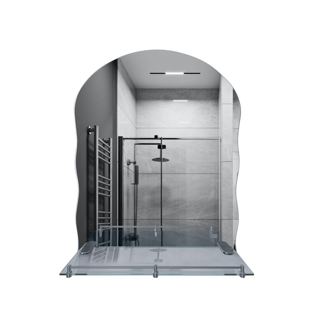 Дзеркало KRM Belantis - ACS702 від Kroner з полицею 432х575х100 кріпиться до стіни за допомогою шурупів, які входять до комплекту. Його можна помістити над умивальником у приміщенні з будь-яким інтер'єром завдяки лаконічному дизайну. Дзеркало виготовлене з дугуватим верхом і фігурними боками. Комплектується разом із поличкою 40х100 мм із прозорого скла з хромованим бортиком, що запобігає випадковому падінню гігієнічних засобів. Полиця кріпиться до дзеркала за допомогою металевих тримачів.