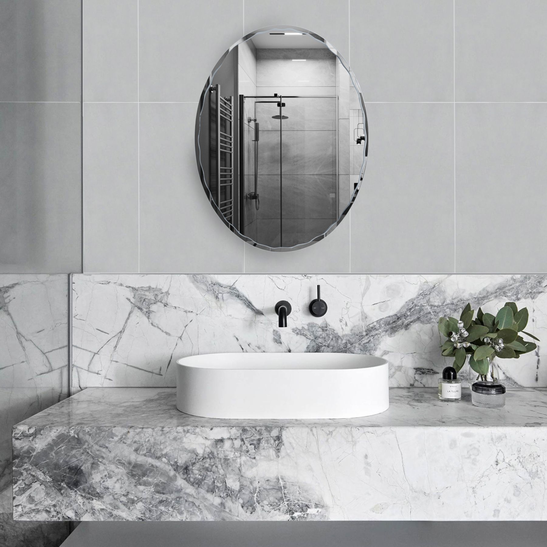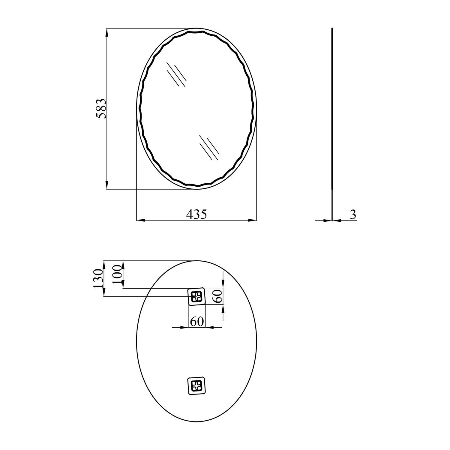 Дзеркало KRM Belantis - ACS711 436х585 від Kroner кріпиться до стіни за допомогою шурупів, які входять до комплекту. Воно вироблене у формі овалу з фігурним візерунком по краю. Поверхня гладка, легко миється за допомогою миючого засобу для скла та сухої серветки.
