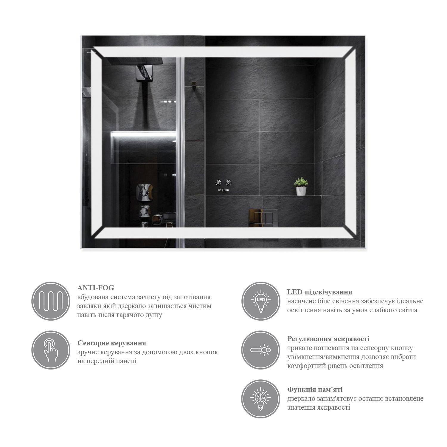 - ANTI-FOG – вбудована система захисту від запотівання, завдяки якій дзеркало залишається чистим навіть після гарячого душу.