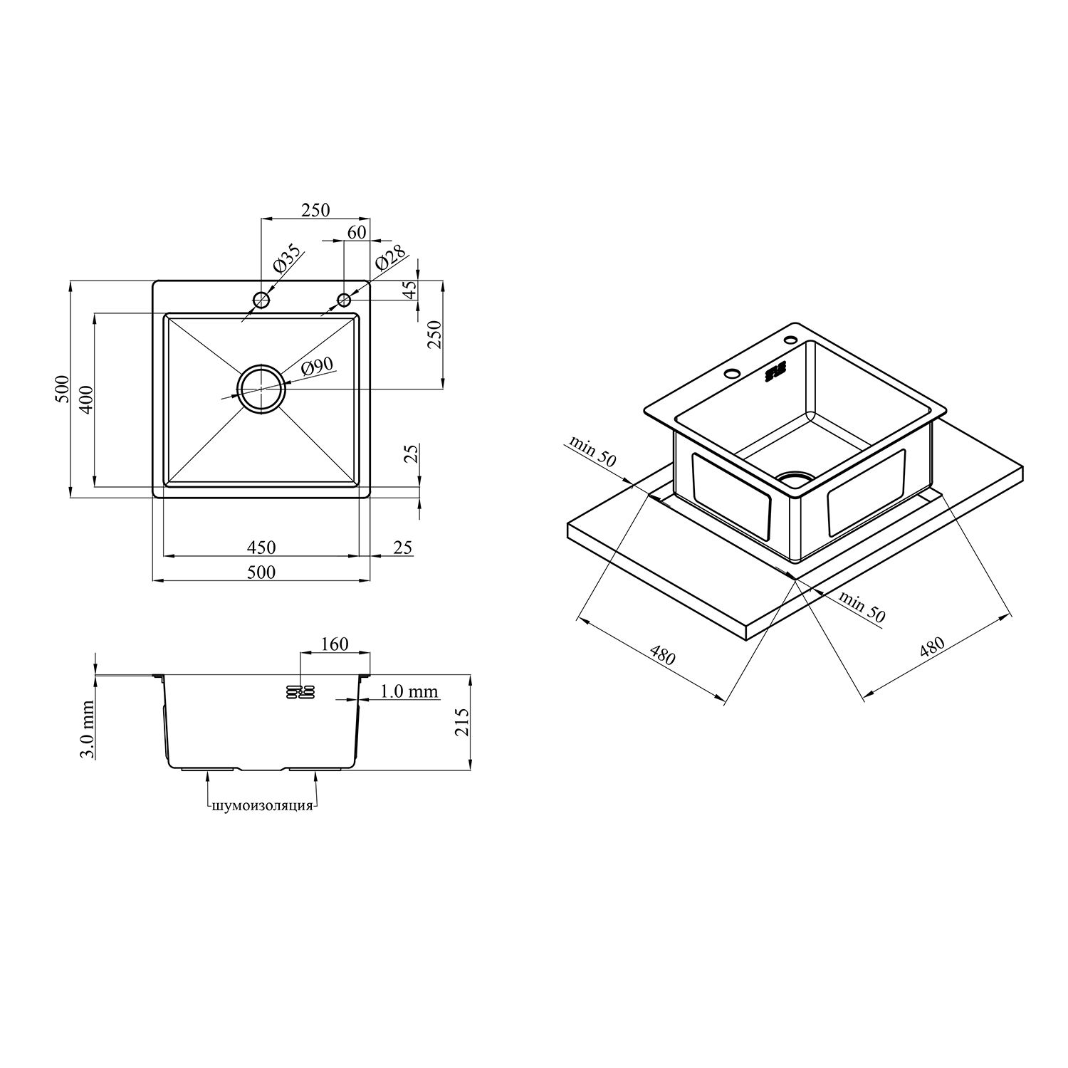 Кухонна мийка Kroner KRP Schwarze - 5050HM PVD (3.0/1.0 мм) | CV022793