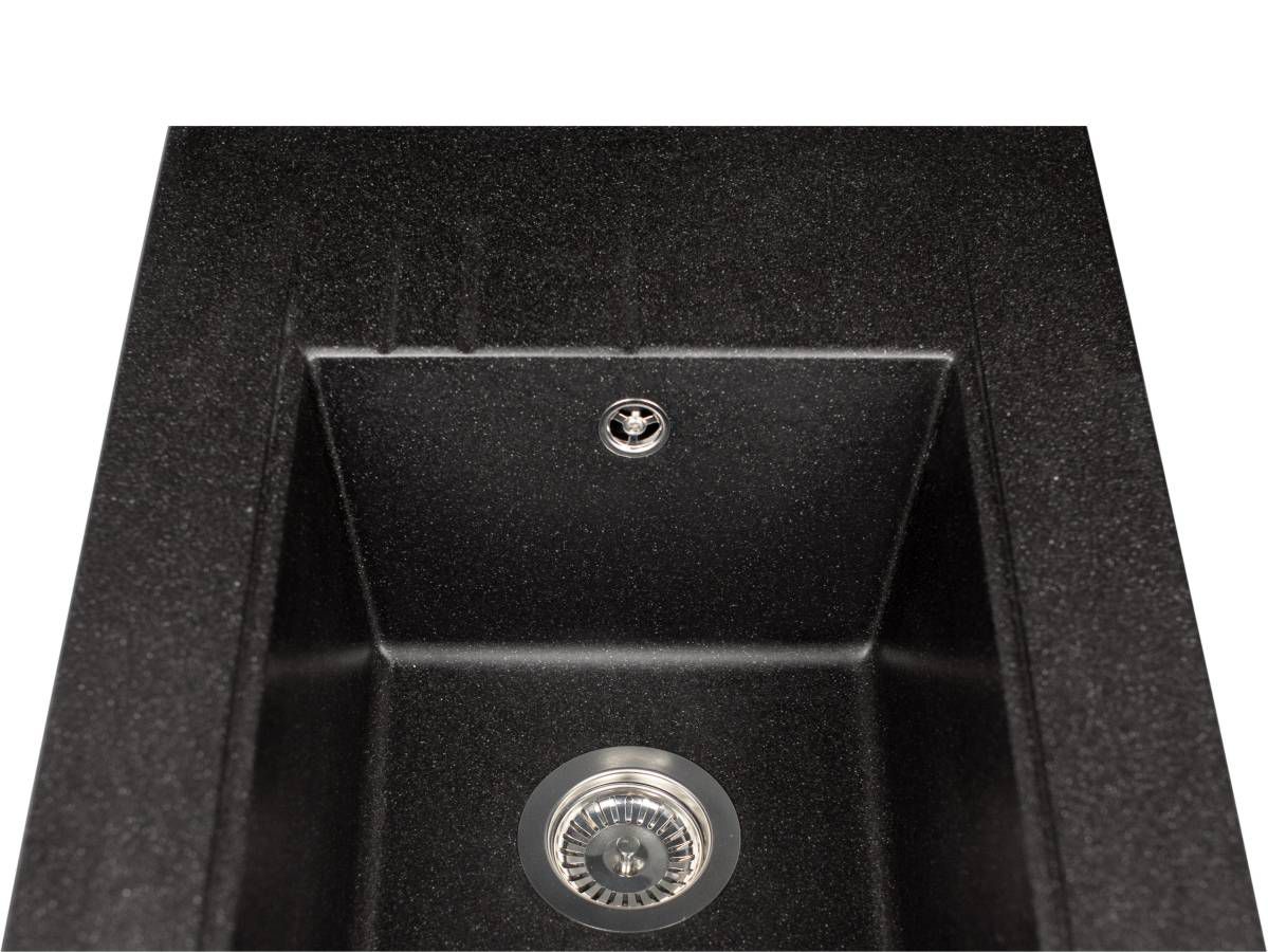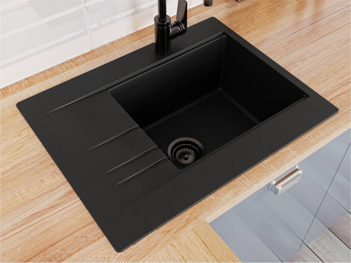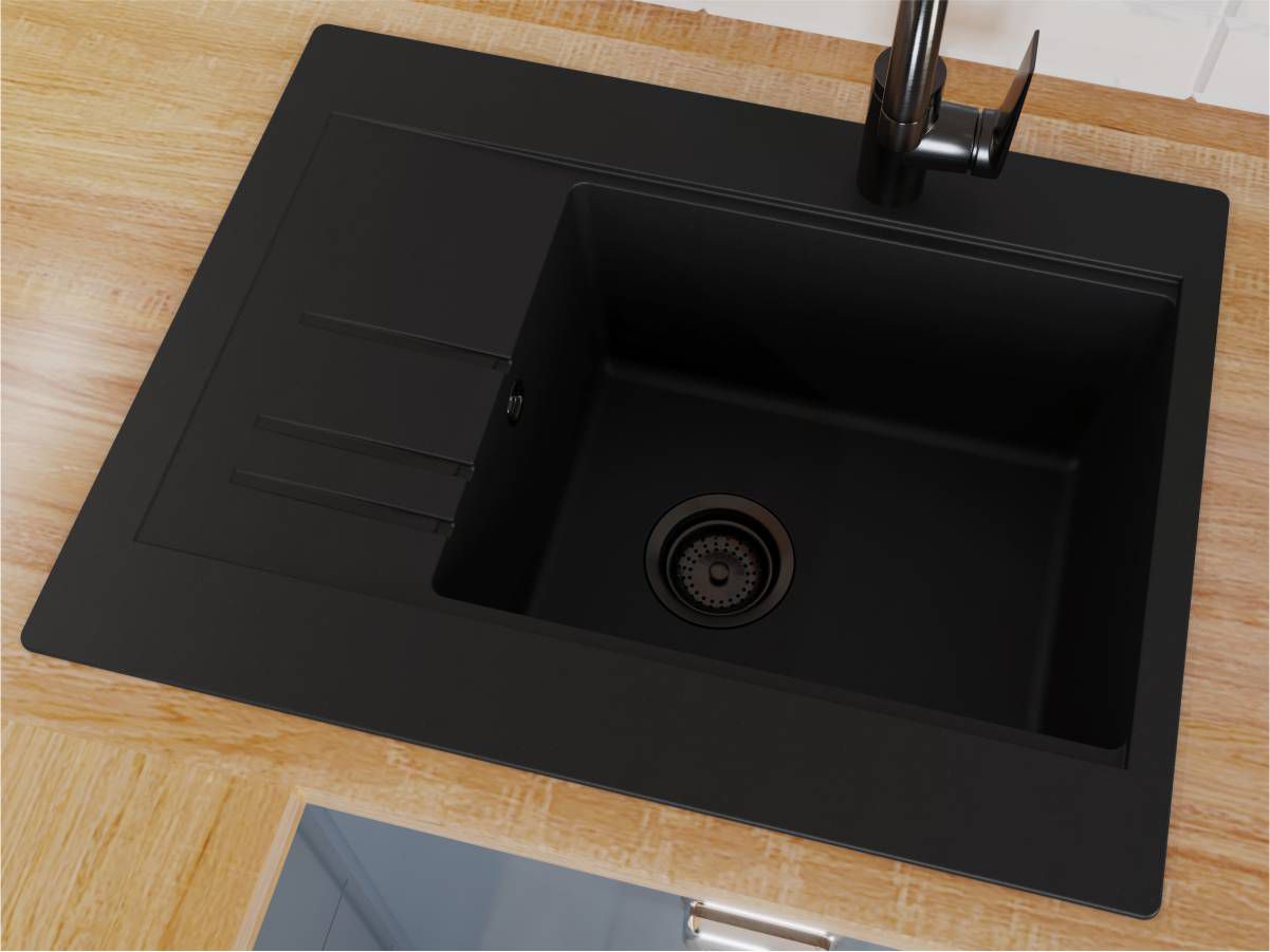 Кухонна мийка BODRUM 650 чорна має однорідну текстуру та колір. Вона не вбирає запахи, відштовхує жир та забруднення, а також не змінює свого кольору у процесі використання.