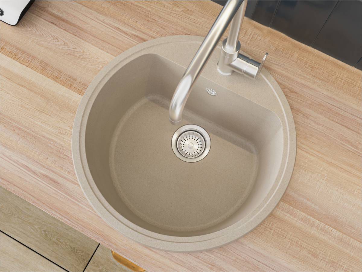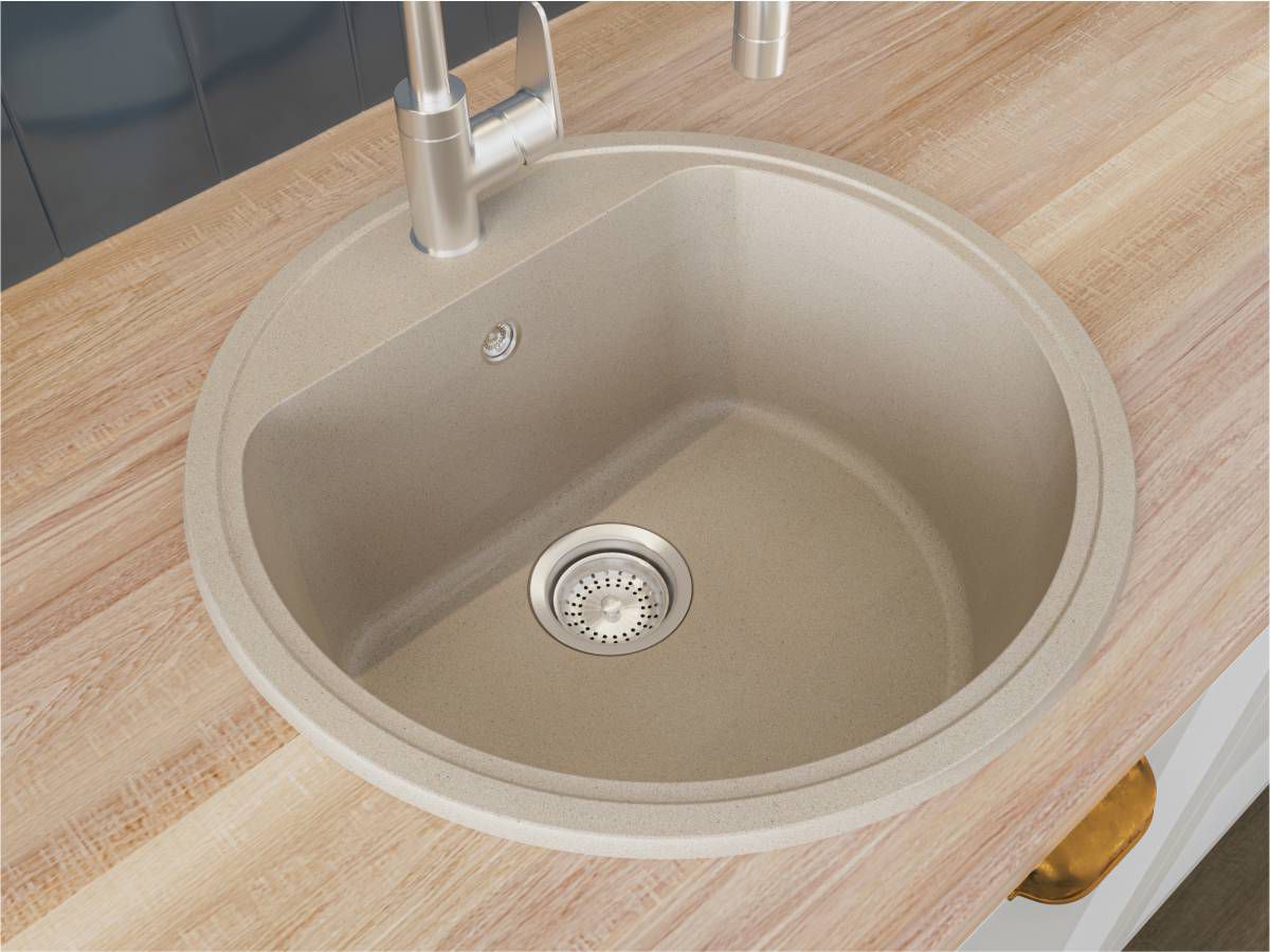 Кухонна мийка MALIBU пісочна має однорідну текстуру та колір. Вона не вбирає запахи, відштовхує жир та забруднення, а також не змінює свого кольору у процесі використання.