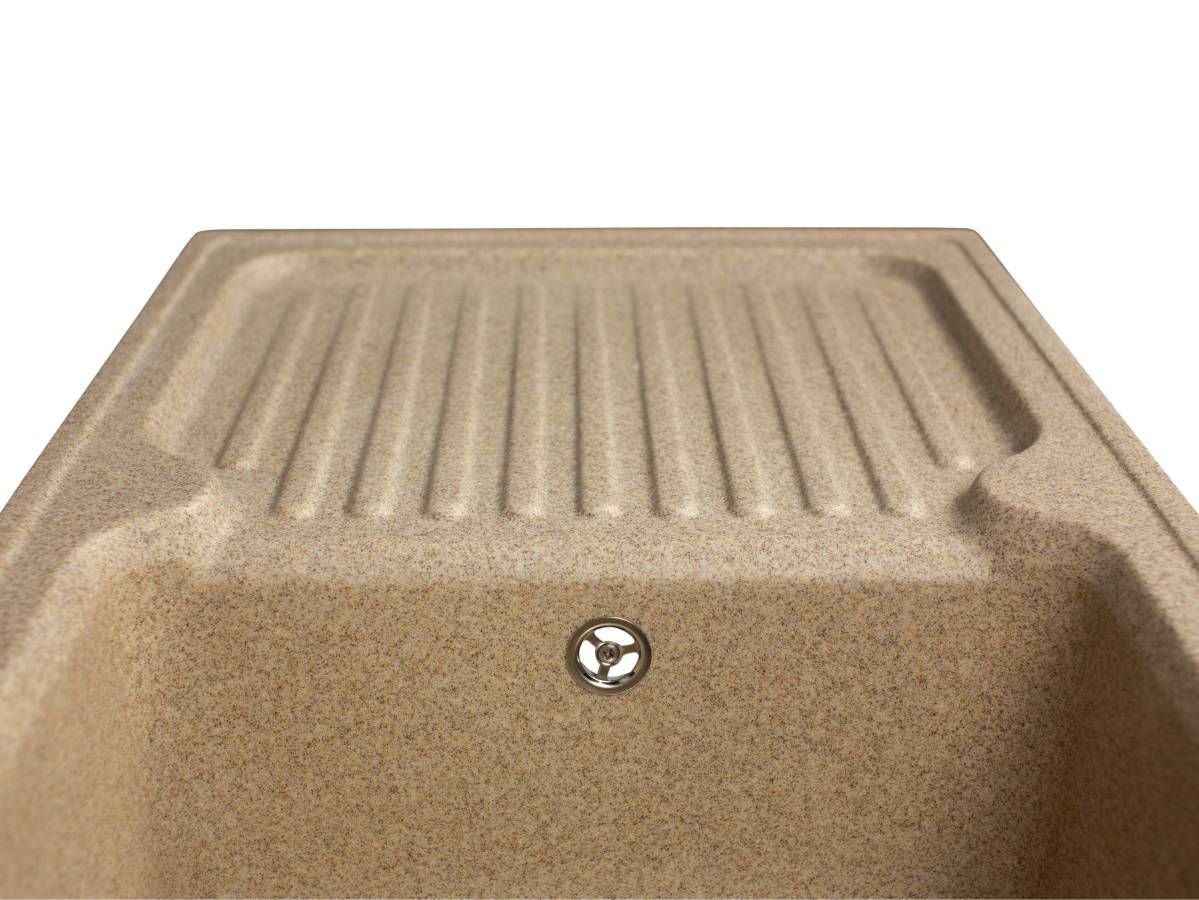 Кухонна мийка ORLEAN терра на 80% складається з кварцового піску та на 20% з поліефірної смоли, яка забезпечує міцність цього виробу. Кухонна мийка витримує перепади температур від -70 до +70 °C та не піддається впливу агресивних побутових барвників.