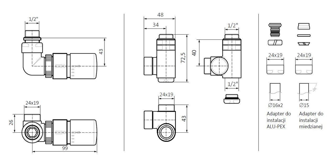 Набір вентилів термостатичний трьохосьовий з трійником лівий хром Terma | WRZTCG4-CR