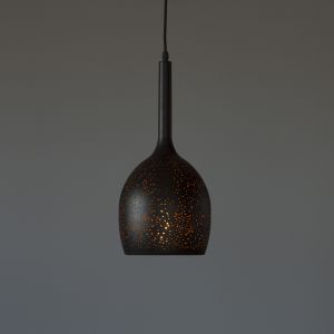Його металева матова поверхня та візерункові прорізи створюють чарівну гру світла, наповнюючи простір теплими відблисками.