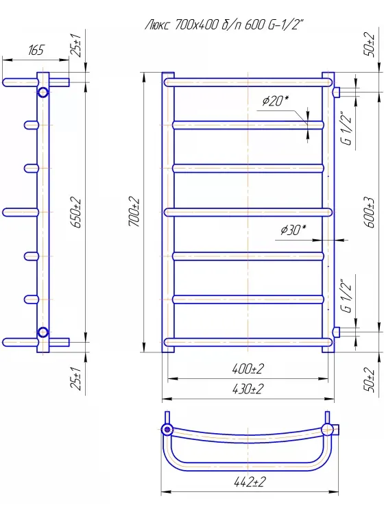Рушникосушка ЛЮКС 700х450/600 Б/П 1/2 | 1.1.2304.02.P