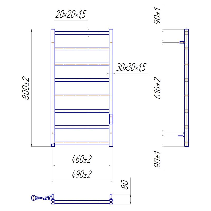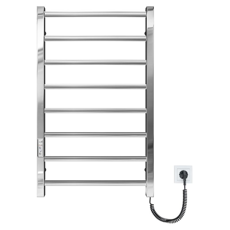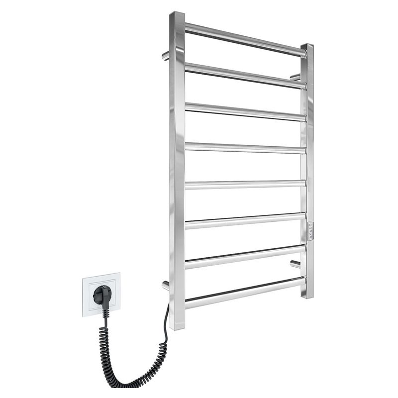 Електросушарка для рушників побутова Токіо-I 800х500/80 TR К. Обладнана таймер-регулятором та конектором для підключення в розетку з будь-якого боку. Сумісна з комплектом прихованого підключення. Має 8 ребер та стояки з квадратного профілю. Виготовлена з полірованої нержавіючої сталі без хромування.