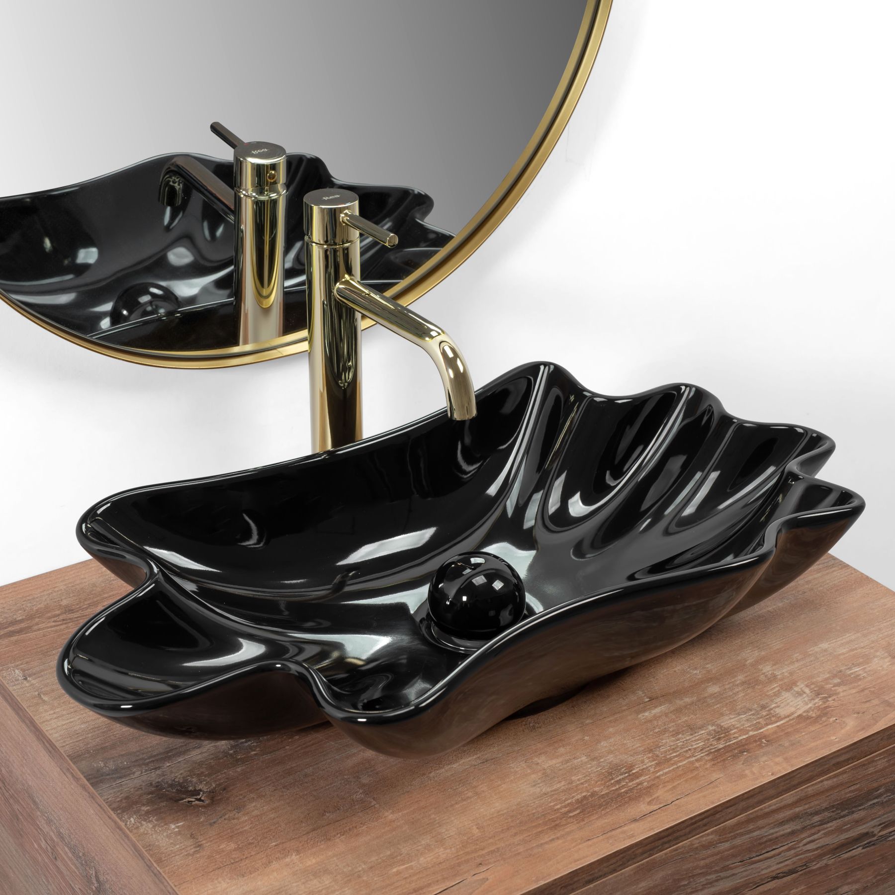 Накладна раковина REA INFINITY виготовлена ??з високоякісної кераміки у чорному кольорі з глянсовим покриттям. Нестандартна форма раковини, що має хвилясті краї, довершує весь образ унікальним донним клапаном, що йде в комплекті у вигляді кулі та має механізм click-clack. Раковина призначена для встановлення на стільницю.