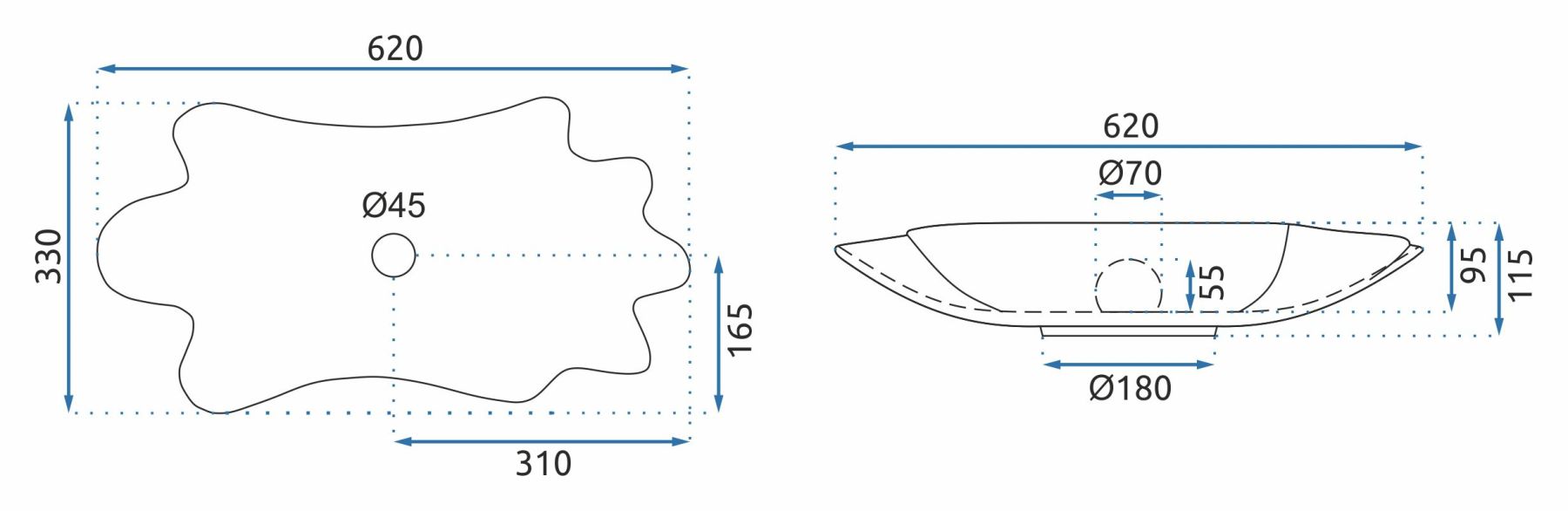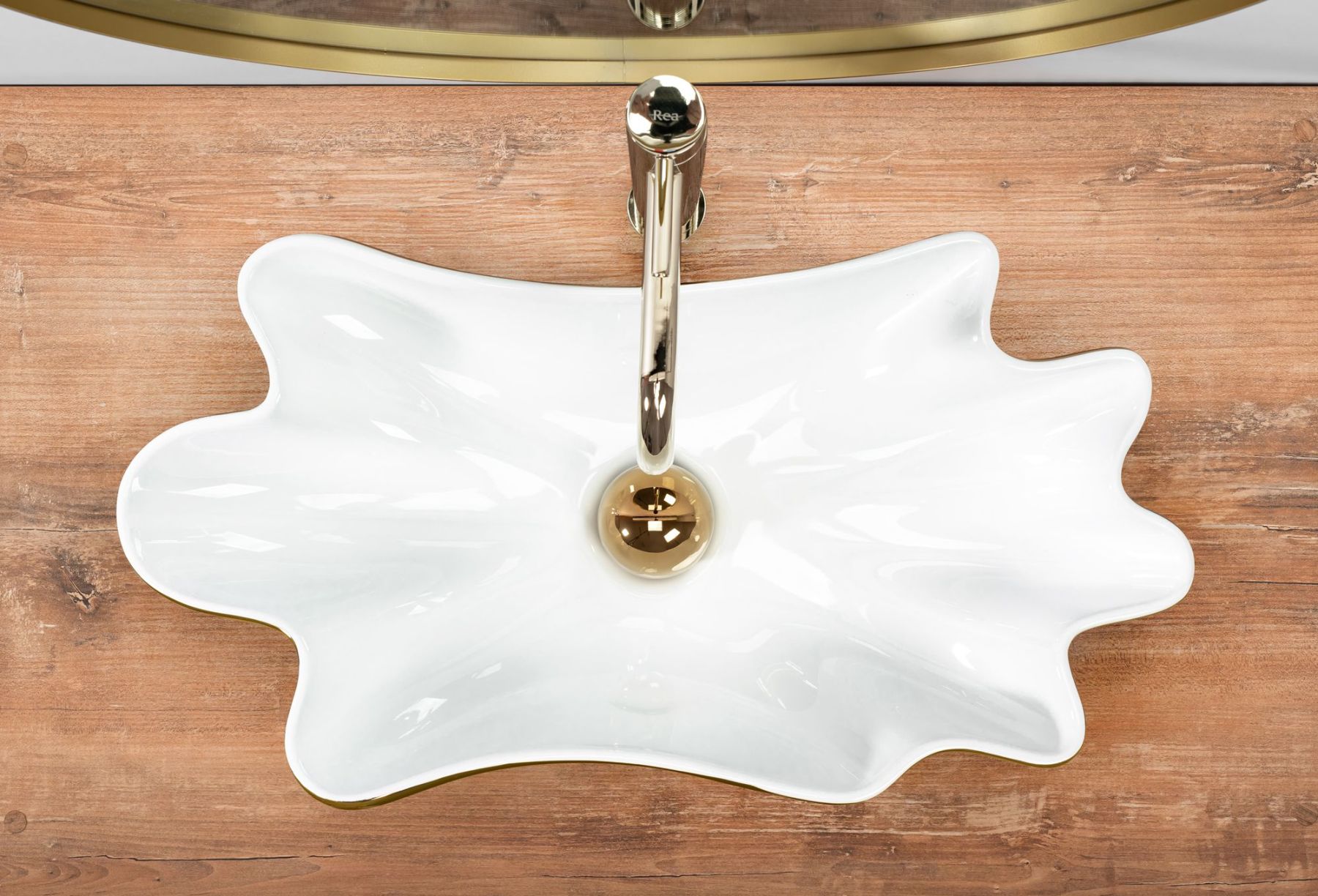 Накладна раковина REA INFINITY виготовлена ??із високоякісної кераміки. Внутрішня частина раковини у білому кольорі, а зовнішня стінка у золотому із глянсовим покриттям. Нестандартна форма раковини, що має хвилясті краї, довершує весь образ унікальним донним клапаном, що йде в комплекті у вигляді кулі та має механізм click-clack. Раковина призначена для встановлення на стільницю.
