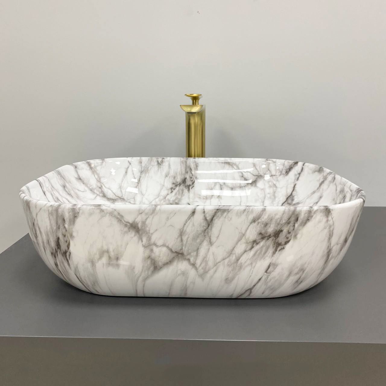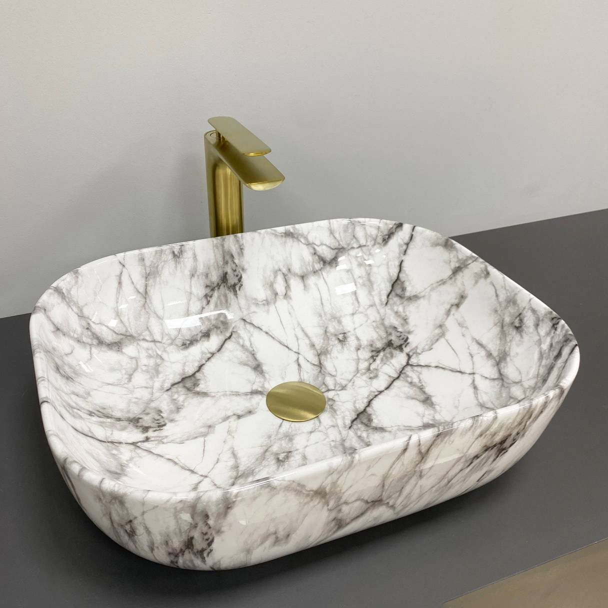 Накладные раковины серии VBI BERGAMO пользуются высоким спросом и доступны в разных цветах в глянцевом исполнении. Классический дизайн с идеальной прямоугольной формой, смягчающийся скругленными углами и тонкими линиями. Модель VBI BERGAMO BLACK STAINS - имеет уникальный узор имитации мрамора с блестящим при свете глянцевым покрытием.