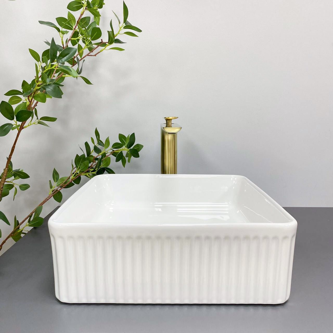 Накладні раковини серії VBI BOLZANO мають високий попит і доступні в різних кольорах у глянсовому або матовому виконанні. Раковина квадратної форми, гладка всередині, а зовні має рифлену текстуру, що надає сучасного вигляду. Призначена для встановлення на стільницю та виготовлена ??з високоякісної кераміки. Модель VBI BOLZANO WHITE – виконана у білому кольорі з глянсовим покриттям.