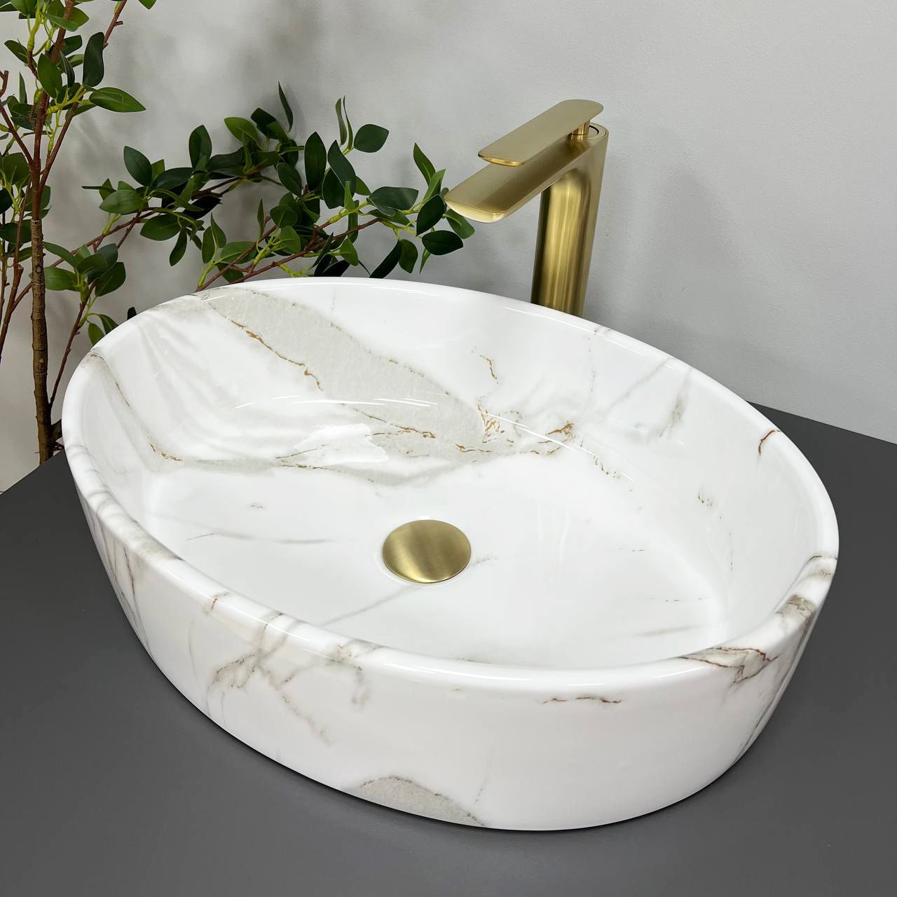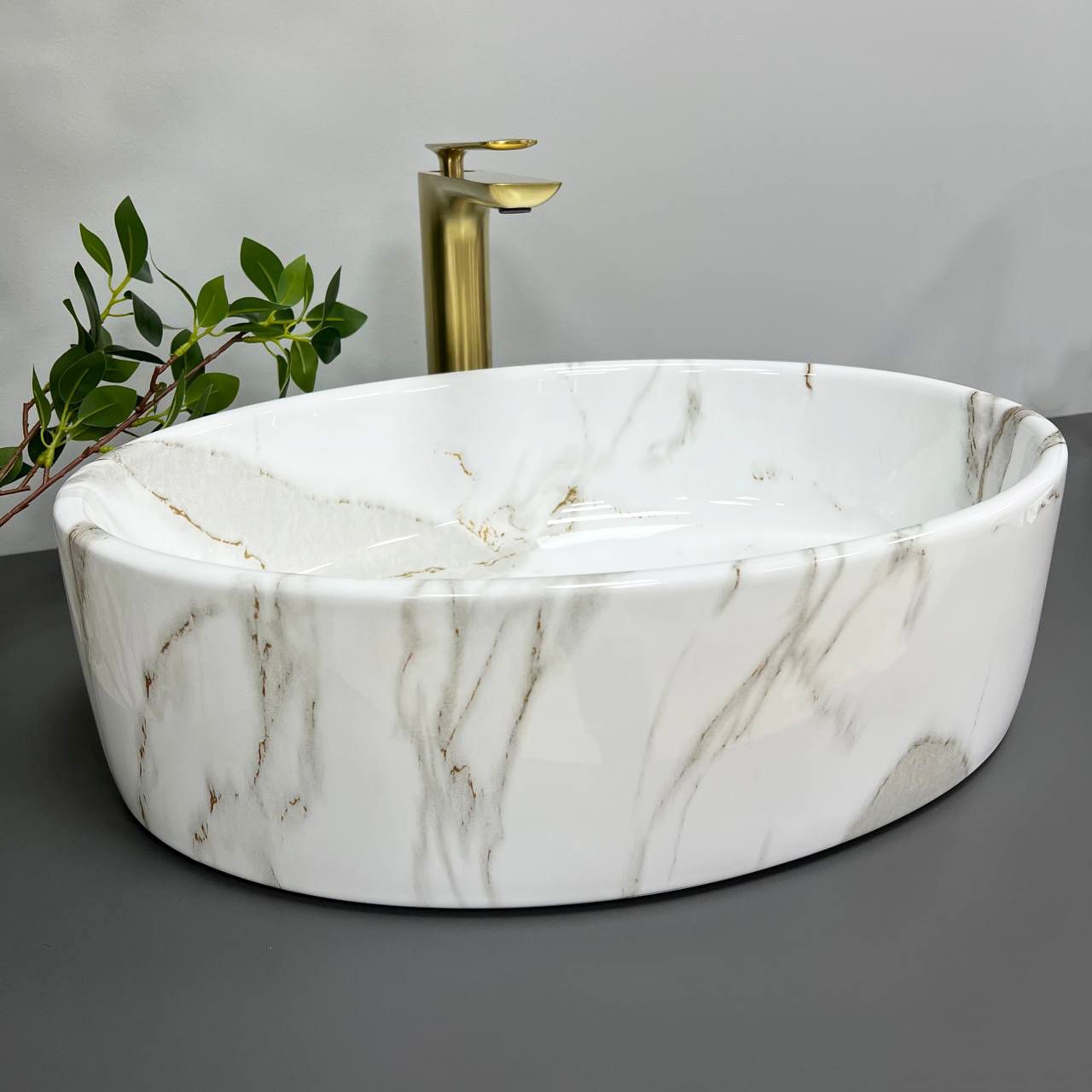 Накладні раковини серії VBI CEFALU мають високий попит і доступні в різних кольорах у глянсовому або матовому виконанні. Накладна за способом встановлення раковина має сучасну овальну форму та високі прямі стінки. Це дозволяє підібрати змішувач як круглої, так і квадратної форми. Модель VBI CEFALU AIAX – має унікальний візерунок, який імітує мармур, а матове покриття надає загального шарму.