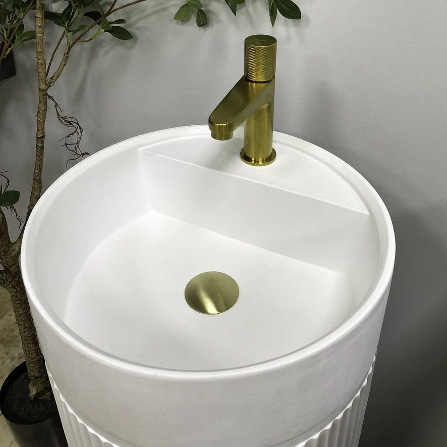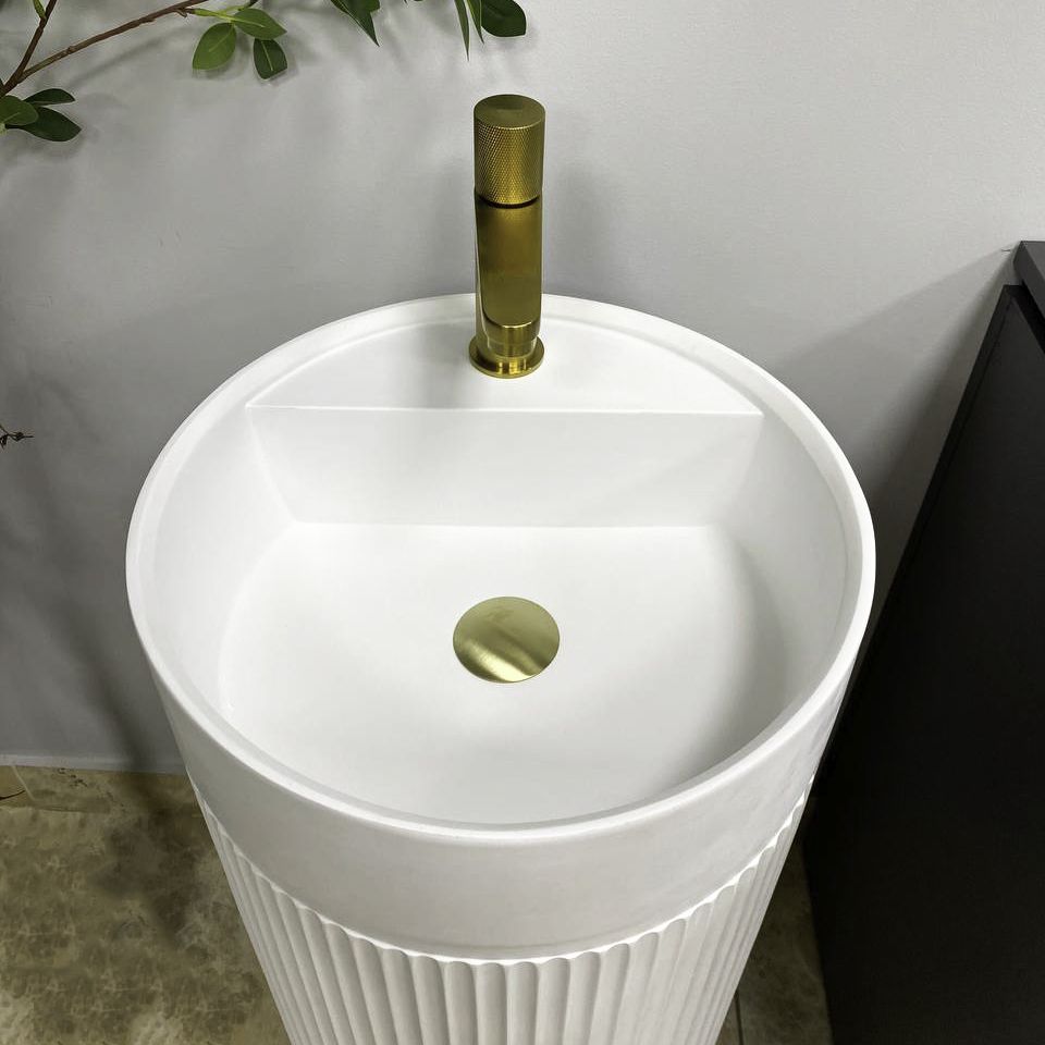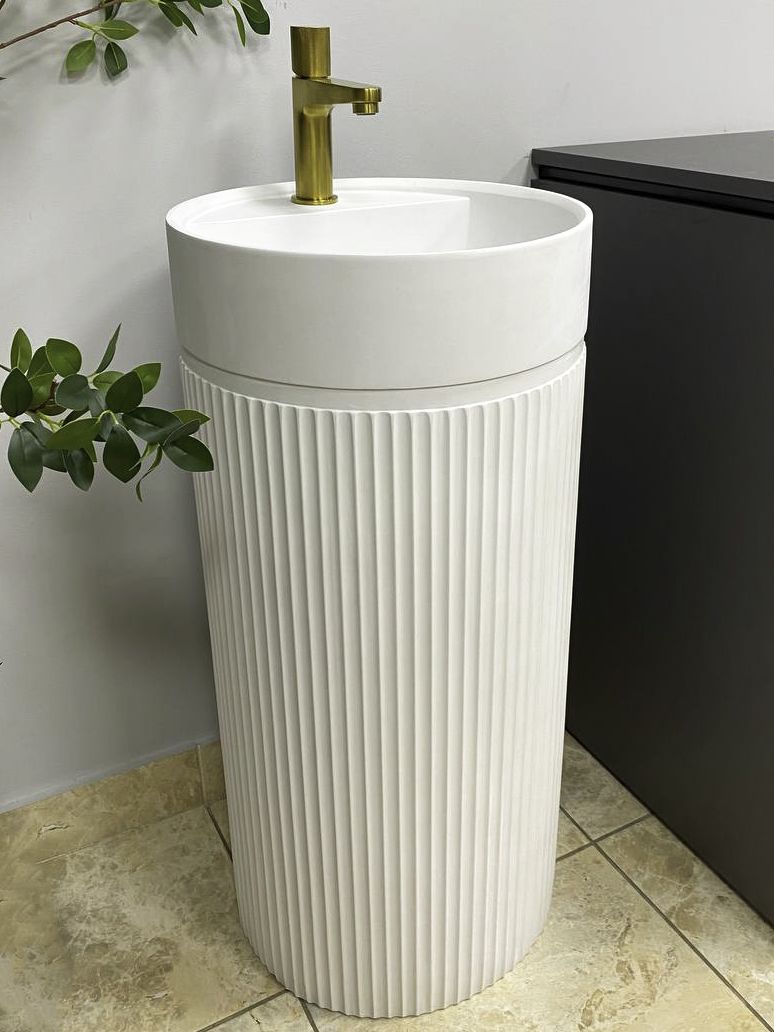 Напольный умывальник с простым и элегантным формами, изготовлен из конгломерата. Идеально подойдет для ванной комнаты в любом стиле. В раковине есть отверстия в задней стенке и в дне, для любого удобного способа подключения к выходу канализации. Раковина имеет отверстие для смесителя, что позволяет сэкономить драгоценное пространство в ванной комнате.