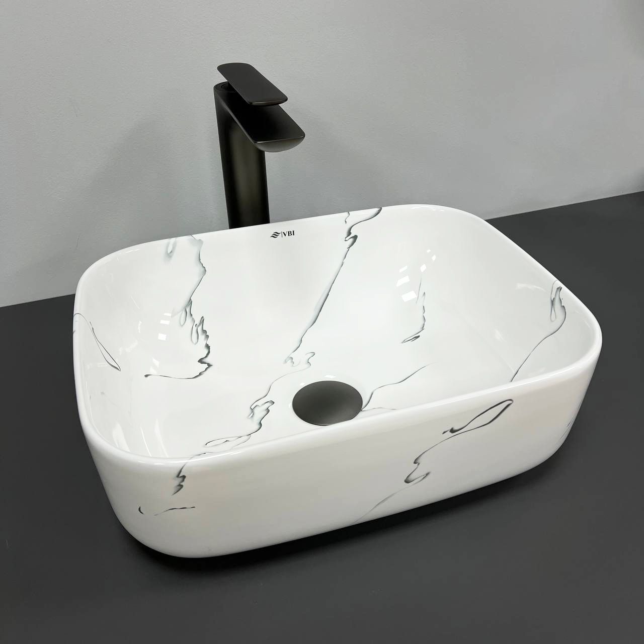 Накладні раковини серії VBI PALERMO мають високий попит і доступні в різних кольорах у глянсовому виконанні. Класичний дизайн з ідеальною прямокутною формою, що пом'якшується округлими кутами та тонкими лініями. Модель VBI PALERMO MARMO - має унікальний візерунок, в основі якого є білий колір з блискучим глянцевим покриттям при світлі.