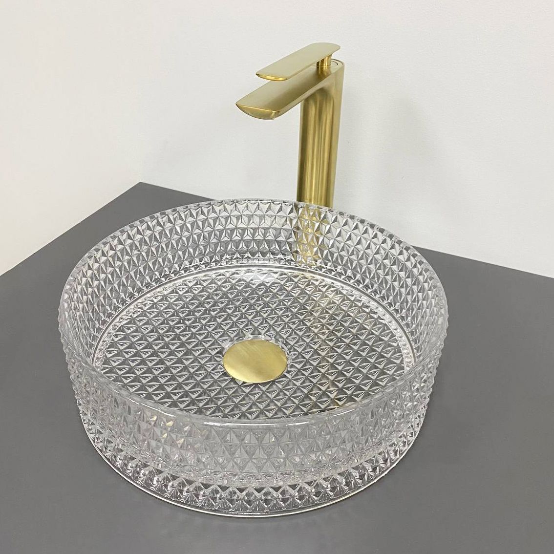 Накладной умывальник VBI SEPINO - изготовлен из прочного прозрачного стекла, что придает ему элегантный и изысканный вид. Раковина имеет идеальную круглую форму, с гладкой внутренней поверхностью, а наружные стенки украшены уникальным текстурированным узором, напоминающим хрусталь. Благодаря игре света этот умывальник создает изящные блики, придавая интерьеру особый шарм и роскошный характер.