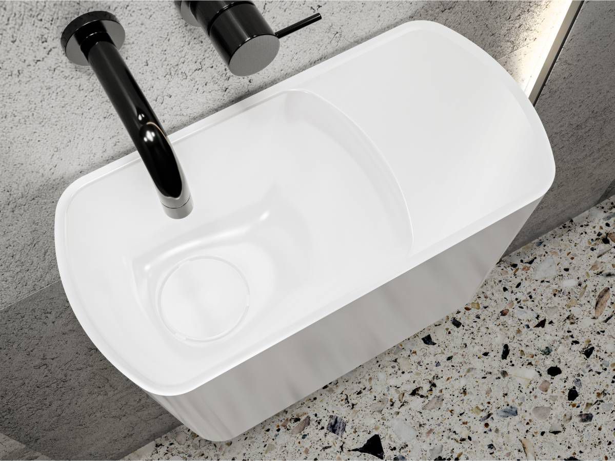 Умивальник Miraggio HELIX L з литого мармуру Miraggio . Литий мармур — твердий та довговічний матеріал. Основним компонентом суміші є мелена мармурова крихта, яку змішують з поліефірними смолами. Раковина покривається антибактеріальним гелем Gelcoat ISO NPG, який робить виріб міцним та білосніжним.