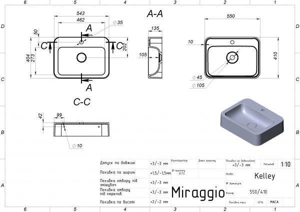 Умивальник Miraggio KELLEY MATT з литого мармуру Miraggio . Литий мармур — твердий та довговічний матеріал. Основним компонентом суміші є мелена мармурова крихта, яку змішують з поліефірними смолами. Раковина покривається антибактеріальним гелем Gelcoat ISO NPG, який робить виріб міцним та білосніжним.