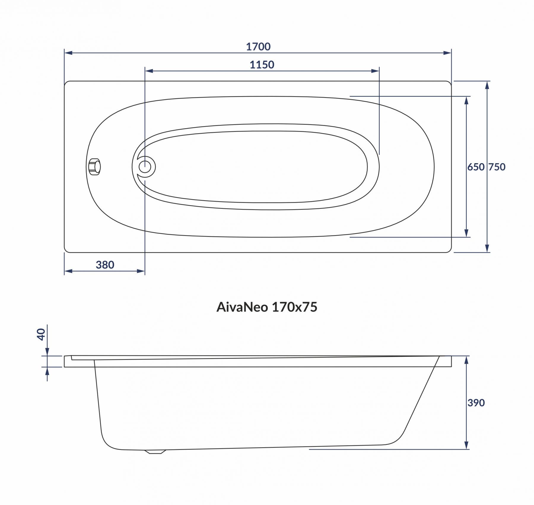 Ванна акрилова AIVA NEO 170*75*39 см без ніжок, 5мм | 1229.001775