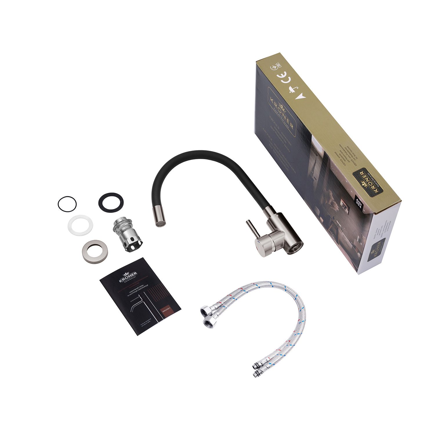 Змішувач для кухні з гнучким виливом Kroner KRP Edelstahl Klassisch - PVD035BLK - ідеальний вибір для вашої кухні. Виготовлений з нержавіючої сталі, він гарантує міцність та довговічність. Має привабливий нікелево-сірий колір, що додає йому елегантності з гнучким чорний виливом. Змішувач оснащений картриджним механізмом змішування, що дозволяє зручно регулювати температуру води. Його унікальна U-подібна форма виливу забезпечує зручність під час наповнення посуду або миття продуктів. Насолоджуйтесь функціональністю і стилем змішувача Kroner.
