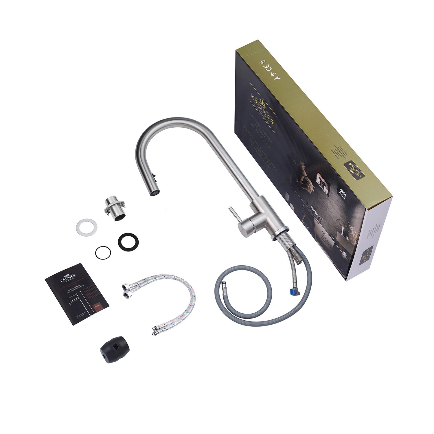 Змішувач для кухні Kroner KRP Edelstahl Klassisch - ESG03915 – це вишуканий виріб з нержавіючої сталі, що поєднує в собі естетику і функціональність. Відмінно підійде для сучасних кухонь. Завдяки одноважільному керуванню і врізному способу монтажу, він легко інтегрується в ваш простір. Брашована поверхня та U-подібна форма виливу надають йому елегантний вигляд. Змішувач оснащений висувним/поворотним виливом, що забезпечує зручність використання. Механізм змішування з картриджем діаметром 35 мм гарантує надійність і довговічність. До комплектації входять гнучка підводка, шланг для висувної лійки, лійка, якір і кріплення, що робить процес установки простим і зручним. Цей змішувач відповідає високим стандартам зручності і стилю на сучасній кухні.