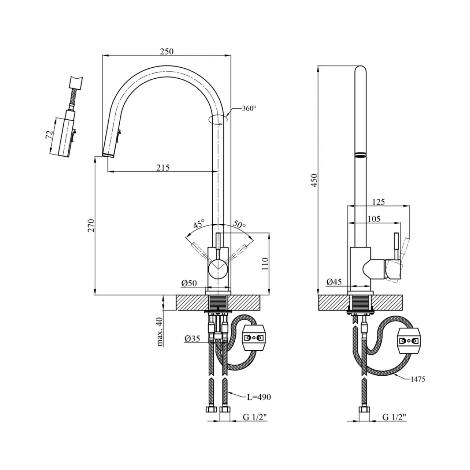 Змішувач для кухні з висувним виливом Kroner KRP Edelstahl Klassisch - ESG03915 | CV032281