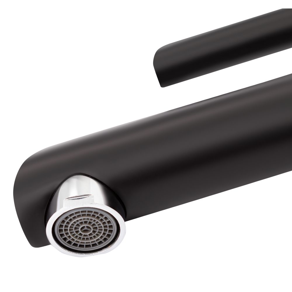 Змішувач для раковини Qtap Grand BCR 001F виготовлено з високоякісної харчової латуні, що стійка до впливу корозії, ударів і тріщин. Матове чорне покриття не тільки підвищує довговічність змішувача, а й надає йому оригінальний зовнішній вигляд. Інтенсивність водного потоку та температура регулюються за допомогою переміщення важеля. Підключення води відбувається через гнучкі шланги з діаметром підключення 1/2".
