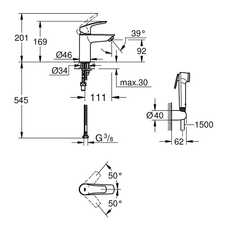 Довжина підводних шлангів, мм.:545