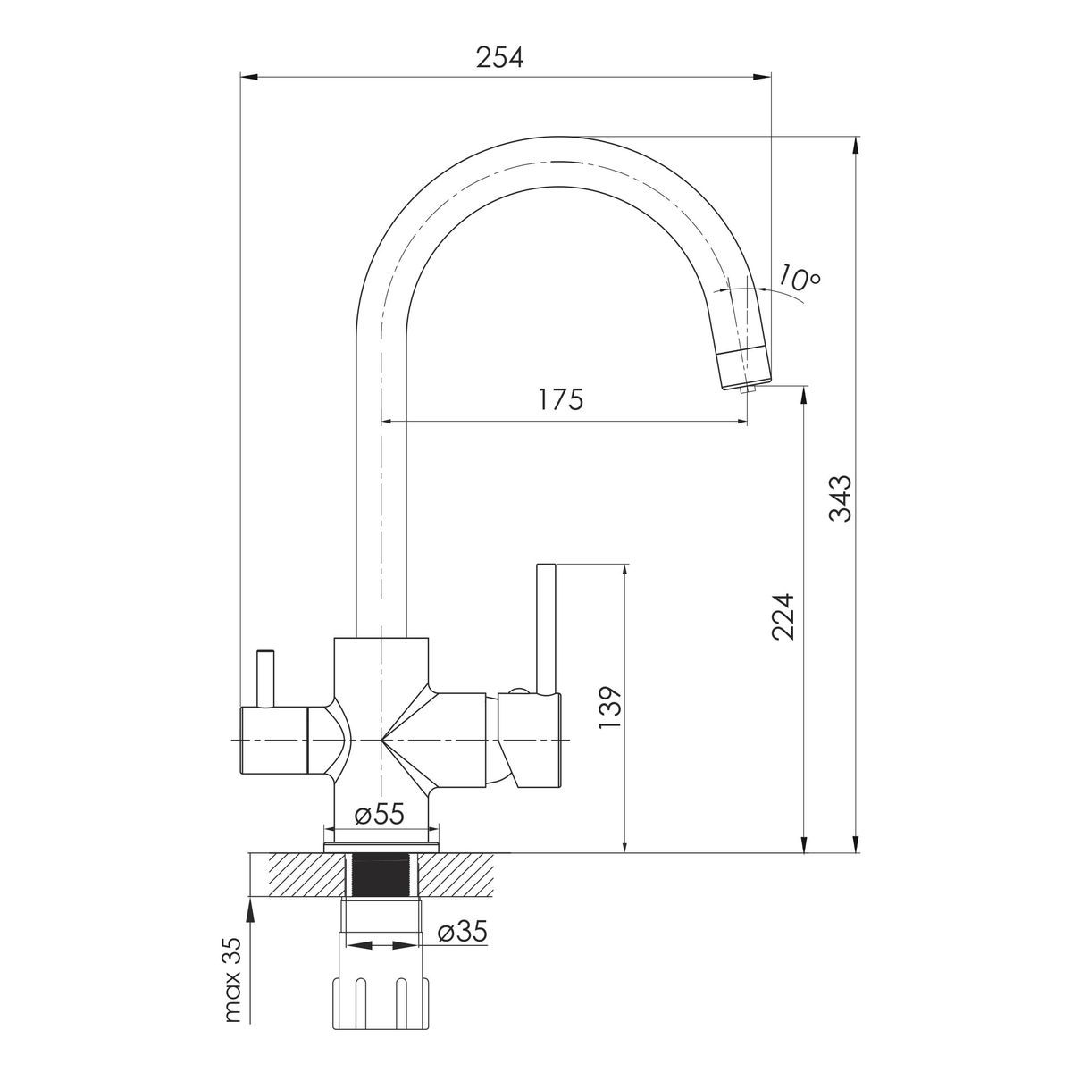 Два канала – для водопроводной и фильтрованной воды, встроенный слив для фильтрованной воды.