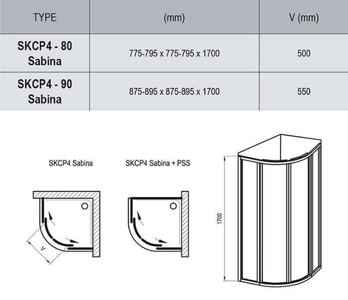 Душевая кабина устанавливается в облицованный кафелем угол ванной комнаты на глубокий поддон Sabina. Общая высота кабины с поддоном составляет 2120 мм. Радиус кабины — 500 мм.