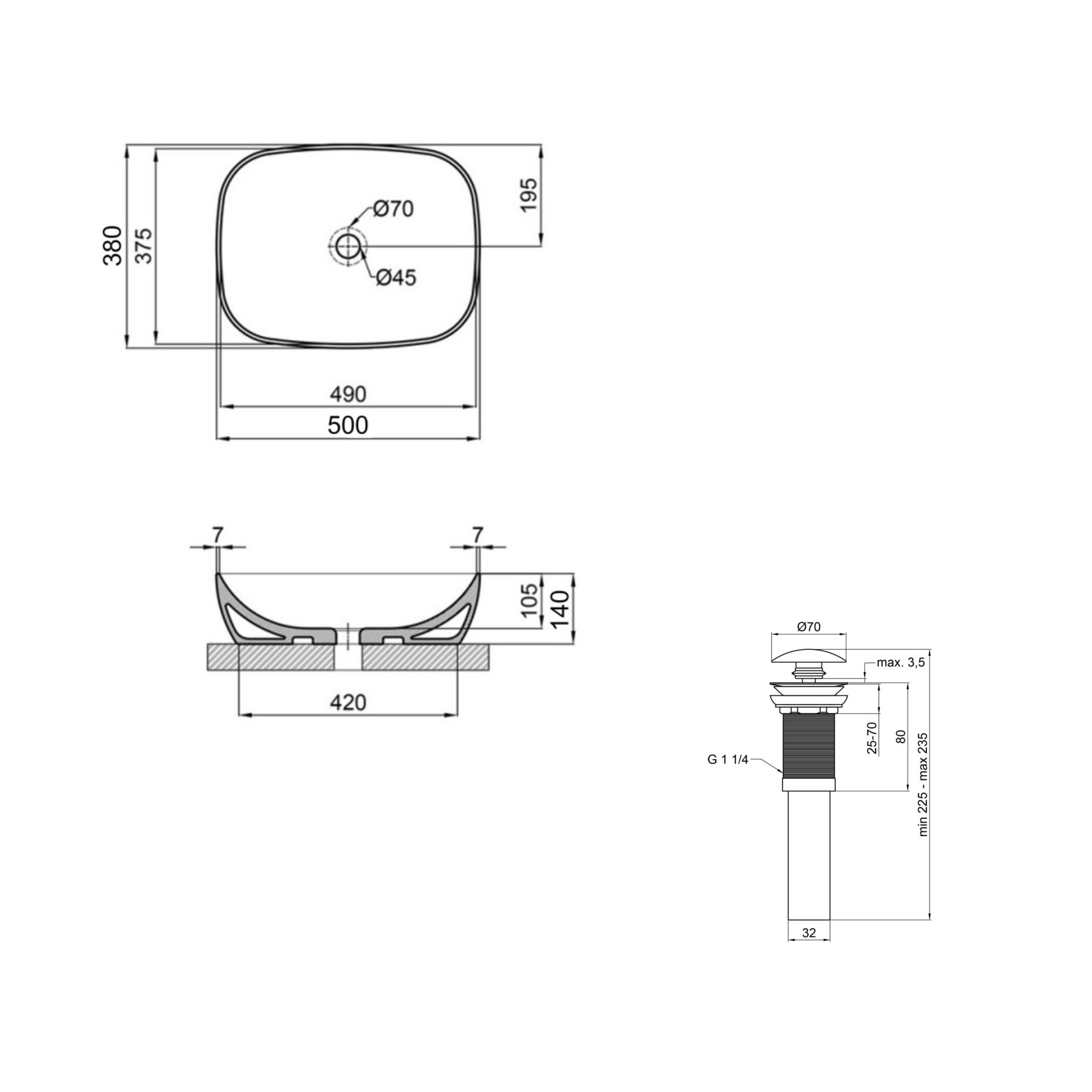 Диаметр сливного отверстия, мм:45