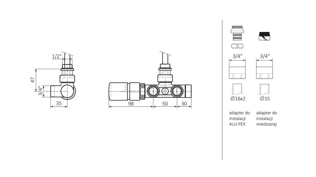 Комплект вентилів термост. 50 мм кутовий з трубкою занур. терм. головка хром лівий WRZT5G5-CR