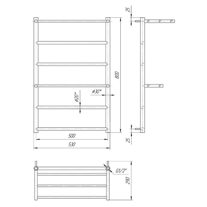 Полотенцесушитель "Марио" Анкона 800х530/500. Размеры: высота – 800 мм, ширина – 530 мм, глубина 273 мм, межцентровое расстояние для подключения – 500 мм, диаметр подключения G1/2”. Варианты подключения: нижнее, диагональное и боковое. Количество ребер – 6, стояки из круглой трубы, особенностью является полка. Изготовлен из полированной нержавеющей стали без хромирования. Тип поверхности: полированная или сатин.