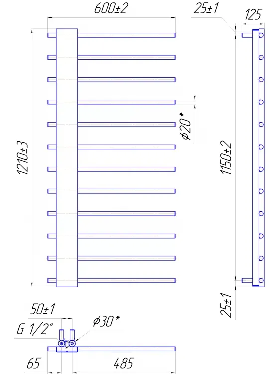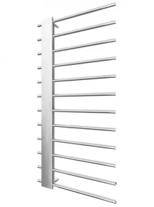 Полотенцесушитель "Марио" Комфорт 1200х600/50. Размеры: высота – 1200 мм, ширина – 600 мм, глубина 100 мм, межцентровое расстояние для подключения – 50 мм, диаметр подключения G1/2”. Варианты подключения: нижнее, диагональное и боковое. Количество ребер – 12, выполненные из круглой трубы. Изготовлен из полированной нержавеющей стали без хромирования.