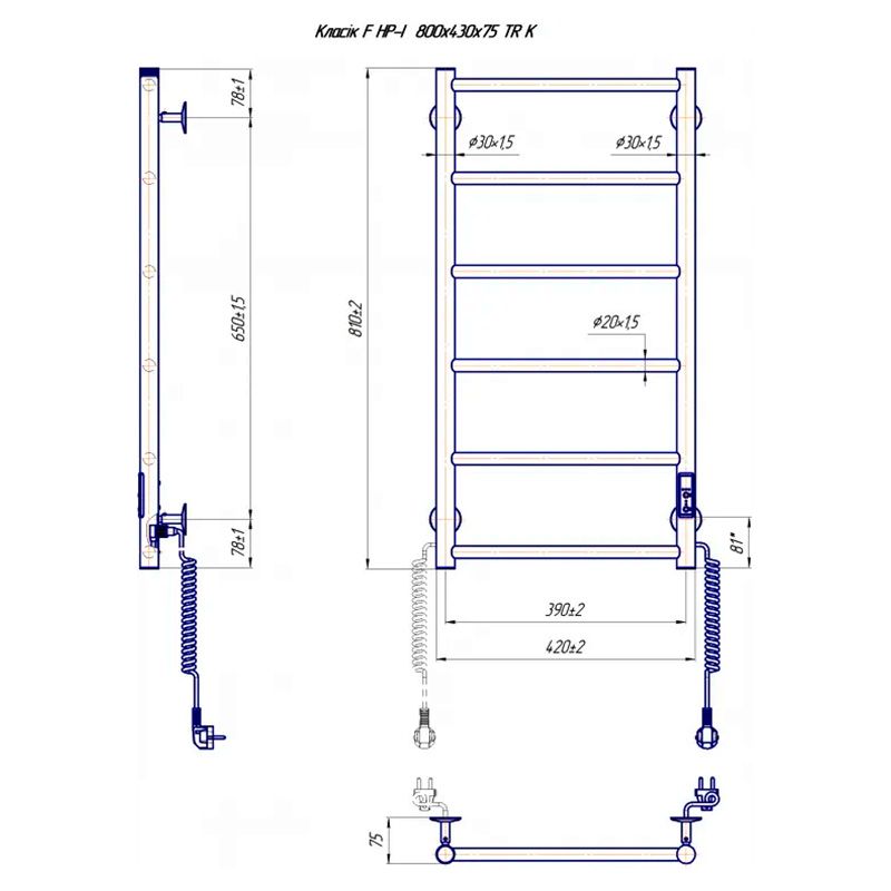 Электросушилка для полотенец бытовая Классик F НР-I 800х430/75 TR K. Оборудована таймером-регулятором и коннектором для подключения в розетку с любой стороны. Совместима с комплектом скрытого подключения. Имеет 6 ребер и стояк из круглой трубы. Изготовлен из полированной нержавеющей стали без хромирования.