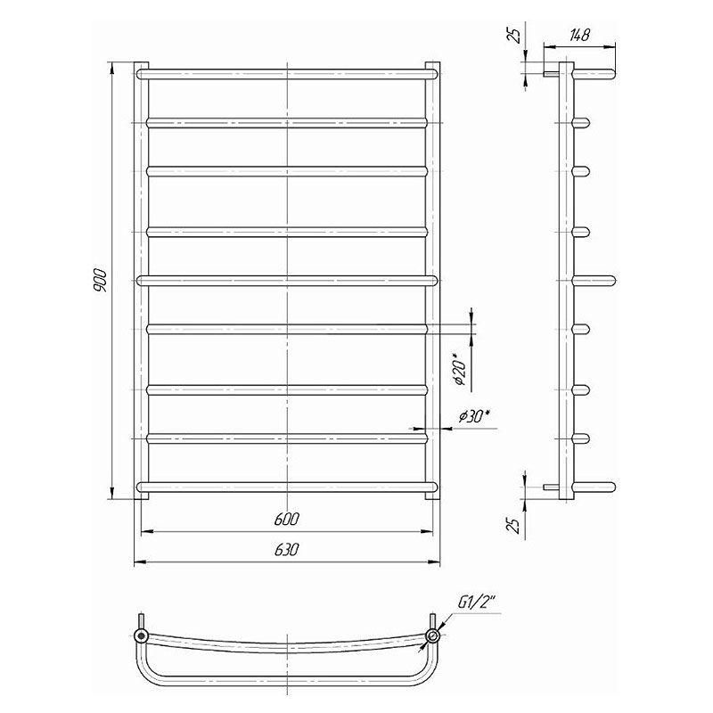Полотенцесушитель "Марио" Люкс 900х630/600. Размеры: высота – 900 мм, ширина – 630 мм, глубина 170 мм, межцентровое расстояние для подключения – 600 мм, диаметр подключения G1/2”. Варианты подключения: нижнее, диагональное и боковое. Количество ребер – 9, стояки из круглой трубы. Изготовлен из полированной нержавеющей стали без хромирования.