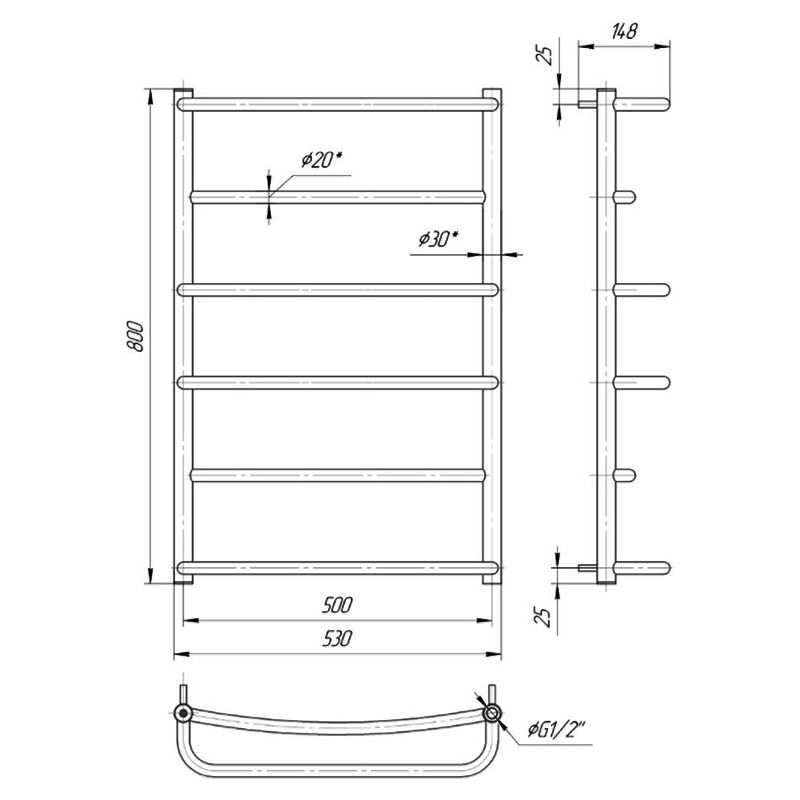 Полотенцесушитель "Марио" Люкс HP 800х530/500. Размеры: высота – 800 мм, ширина – 530 мм, глубина 170 мм, межцентровое расстояние для подключения – 500 мм, диаметр подключения G1/2”. Приставка HP (Heat Point) – линейка водяных и электрических полотенцесушителей эконом-сегмента. Единственным отличием является меньшее количество перемычек по сравнению с изделиями стандартного или премиум сегмента. Варианты подключения: нижнее, диагональное и боковое. Количество ребер – 6, стояки из круглой трубы. Изготовлен из полированной нержавеющей стали без хромирования.