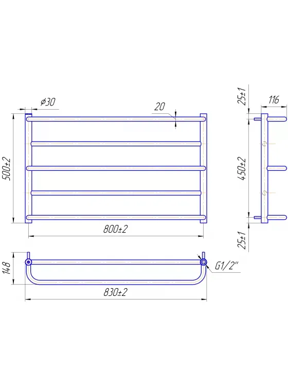 Полотенцесушитель "Марио" Люкс Сити 500х830/800. Размеры: высота – 500 мм, ширина – 830 мм, глубина 150 мм, межцентровое расстояние для подключения – 800 мм, диаметр подключения G1/2”. Варианты подключения: нижнее, диагональное и боковое. Количество ребер – 5, стояки из квадратного профиля. Изготовлен из полированной нержавеющей стали без хромирования.