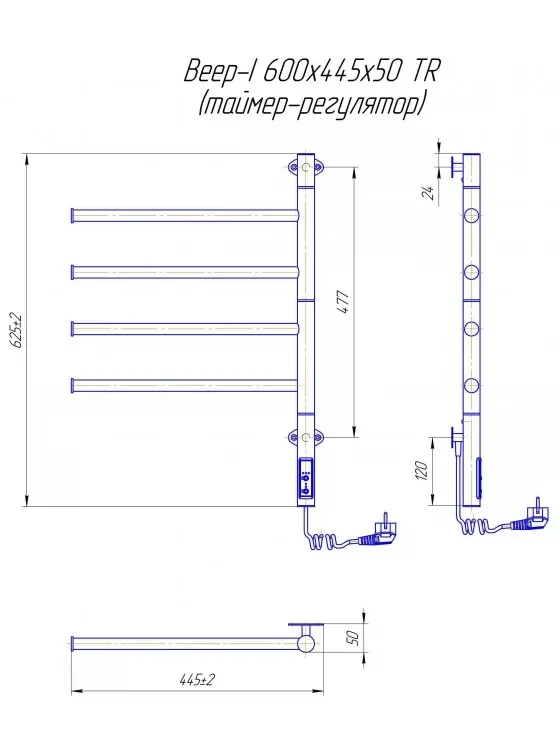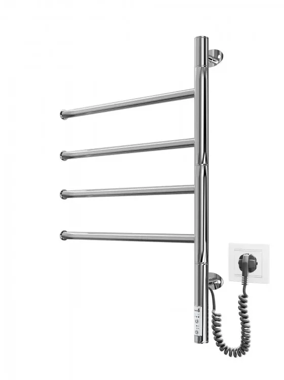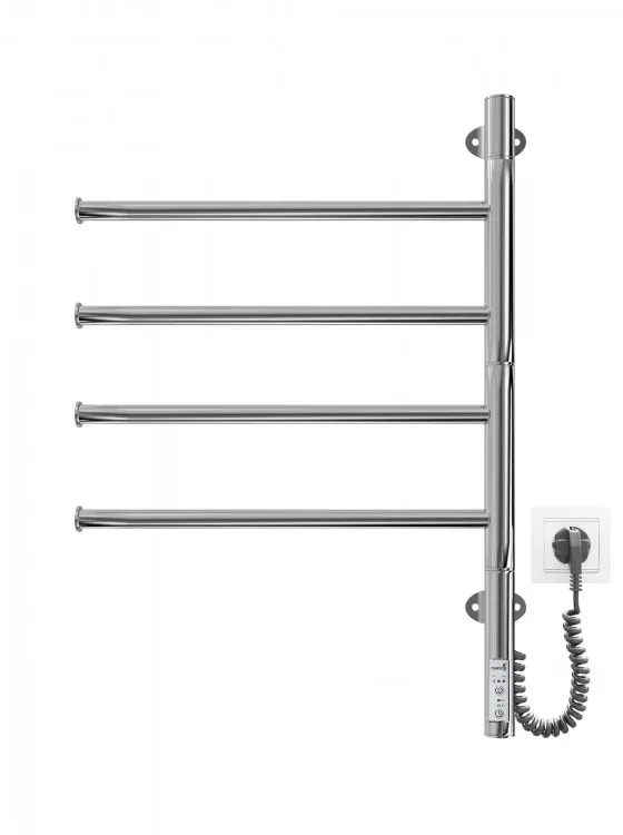 Электросушилка для полотенец бытовая Веер-I 600х445/55 TR. Оборудована таймер-регулятором. Возможна вариация с комплектом скрытого подключения. Имеет 4 ребра, которые возвращаются на 180* и стояк из круглой трубы. Изготовлен из полированной нержавеющей стали без хромирования. Варианты покрытия: полированная. Температурные режимы таймер-регулятора: 40°С, 45°С, 50°С. Варианты времени: 3, 6 часов и постоянный нагрев. Мощность 50 Вт. Дополнительно для удобства использования можно оснастить навесными крючками. Гарантия – 5 лет.