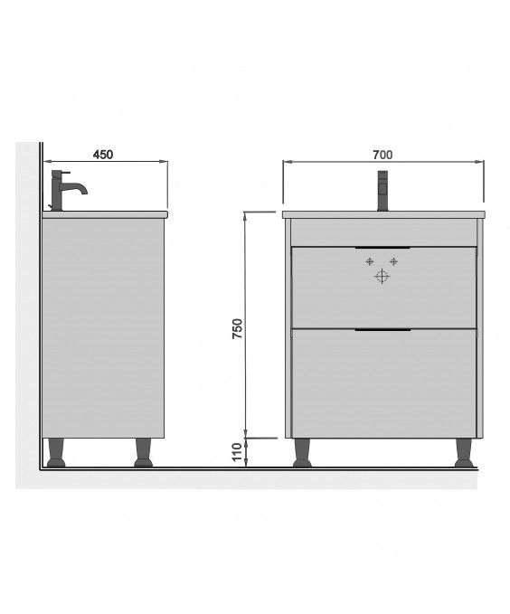 В колекції присутні підлогові тумби з умивальником шириною 60 см та 80 см.