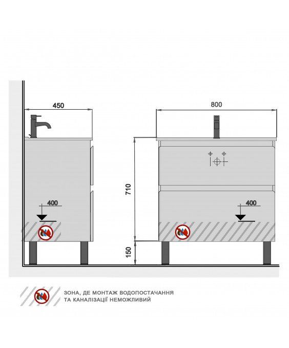 «Палермо Світлий бетон» від MDD Group - це серія універсальних меблів, яка однаково органічно виглядає і в підлоговому варіанті, і в підвісному (комплектація тумб і пенала передбачає обидва варіанти установки). У тумбах колекції передбачено підключення «з підлоги». Висока нога (опора 15 см) робить прибирання під меблями зручним навіть у невеликих приміщеннях.