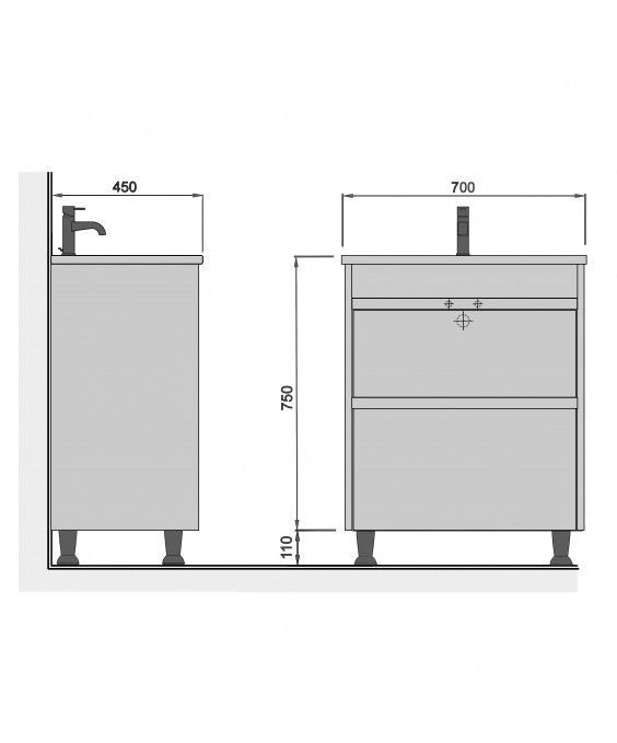 Prime 70 - це тумба з умивальником, що оснащена двома висувними ящиками і умивальником Cosmopolitan 70. Ящики оснащені системою плавного закривання Hettich (Німеччина)