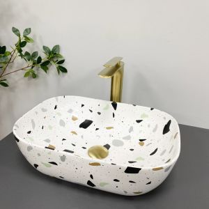Накладные раковины из коллекции VBI RAVENNA имеют современную прямоугольную форму со смягченными закруглениями. Универсальный дизайн позволяет подобрать смеситель любой формы. Раковина изготовлена из керамики высочайшего качества, отличающейся высокими гигиеническими свойствами. Модель VBI RAVENNA TERAZZO имеет уникальный узор. В основе есть белый цвет, украшенный хаотическими, цветными пятнышками это придает раковине яркий характер.