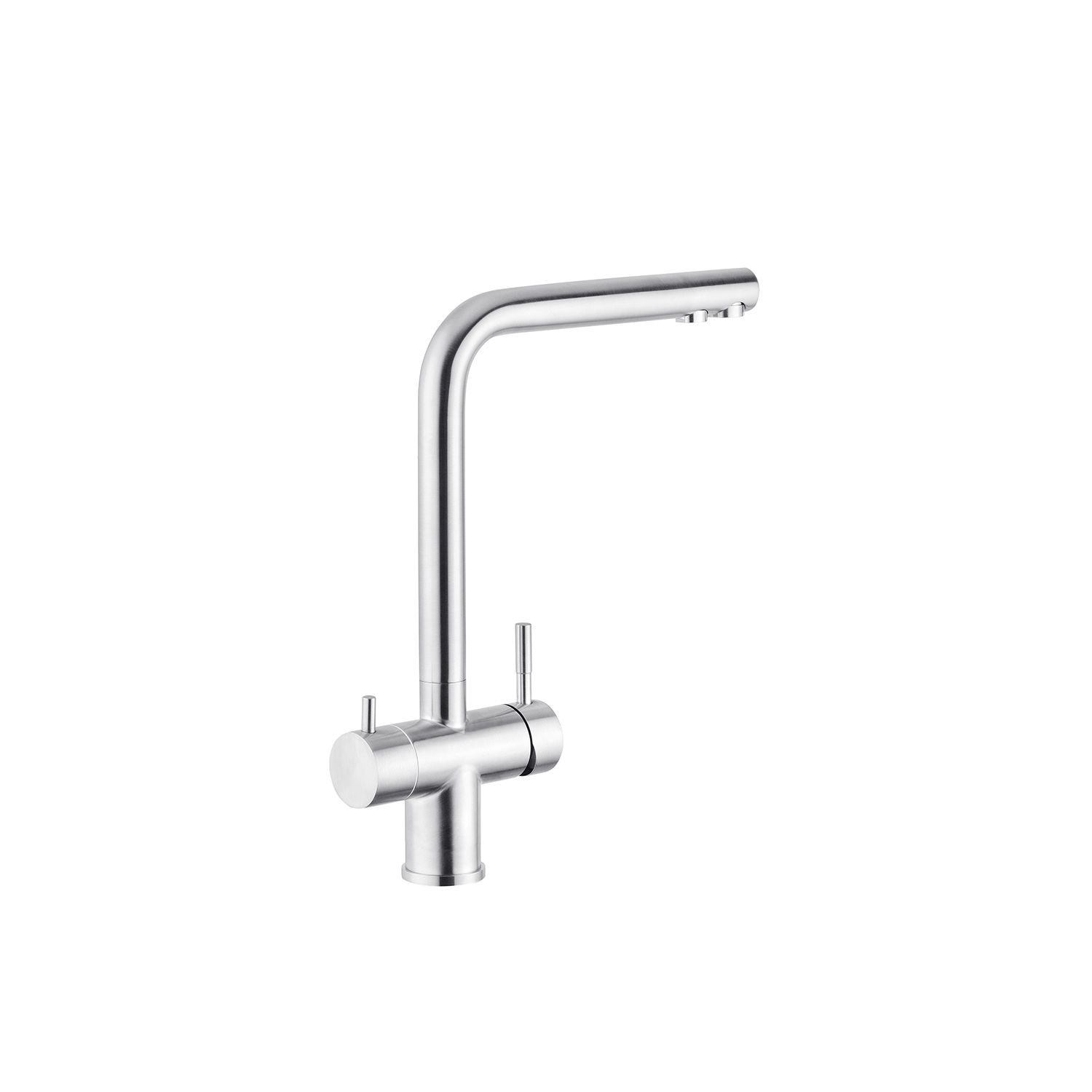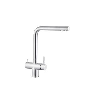 Смеситель для кухни с подключением к фильтру Kroner KRP Edelstahl Klassisch - ESG03811 изготовлен из высококачественной нержавеющей стали, не подверженной коррозии, устойчив к ударам и появлению трещин. Смеситель имеет Г-образную форму с тремя контурами подключения воды. При участии первого и второго осуществляется подключение холодной и горячей воды, где смешивание происходит с помощью картриджа.